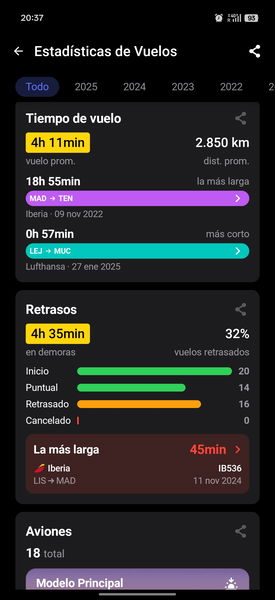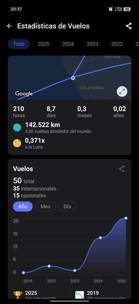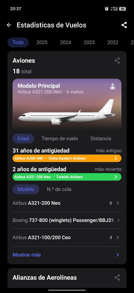 Incluso me alerta de curiosidades, como que volé en un aparato con 31 años de antigüedad (un dato que aparece en mis estadísticas sobre un A350, aunque sospecho que es un error de base de datos o una matrícula reutilizada de un avión histórico, ya que el A350 es mucho más moderno; pero el hecho de que la app intente darte esa profundidad de datos es genial para investigar).