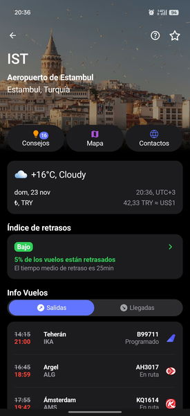 byAir democratiza esta información. Te da el contexto que las aerolíneas suelen ocultar para no generar pánico en la sala de espera. En mi última escala en Estambul, la app me avisó de un retraso acumulado de 3 horas y 40 minutos en el vuelo de conexión. Lo supe horas antes de llegar al aeropuerto, lo que me permitió gestionar el traslado con una calma que el resto de pasajeros no tenía.