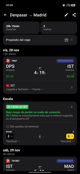 Y ojo al soporte para Wear OS. Si sois usuarios de un Pixel Watch o un Galaxy Watch, la aplicación compañera es una delicia. Poder ver el código QR de la tarjeta de embarque o el número de puerta con un giro de muñeca mientras llevas las manos ocupadas con el café y el pasaporte es esa clase de "calidad de vida" tecnológica a la que cuesta renunciar una vez la pruebas.