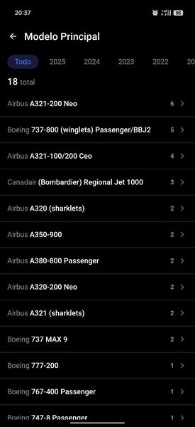 Pero byAir va al detalle friki que nos encanta. Me desglosa qué modelos de avión he usado más. Resulta que soy un habitual del Airbus A321-200 Neo (6 vuelos) y del Boeing 737-800.