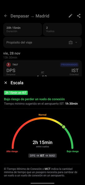 Este dato es oro puro. El MCT es un estándar de la industria que varía según el aeropuerto y el tipo de vuelo (doméstico vs internacional). Que la app cruce mis datos de vuelo con el MCT del aeropuerto y me diga "tranquilo, tienes margen" o "corre, vas justo" es tener un asistente personal de viajes en el bolsillo.