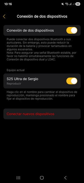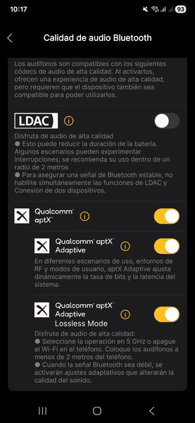 En lo que respecta al códec, hace poco hablamos de que fuera del laboratorio no todos son lo que dicen, con LDAC sufriendo especialmente y AAC a medio gas fuera de iOS. Precisamente por eso mis pruebas han sido con aptX —One UI 8 tiene la mala costumbre de no especificar cuál de todos exactamente— la práctica totalidad del tiempo, sin que haya habido caídas en la conexión y permitiéndome disfrutar de una calidad de sonido bastante aceptable para un protocolo tan limitado como es Bluetooth. Tiquismiquis que es uno, qué le vamos a hacer.