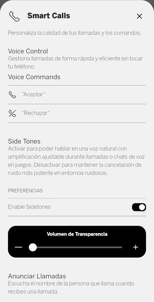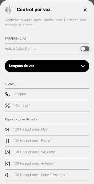 El control por voz es, sencillamente, brillante. Es posible dirigirse directamente a los auriculares mediante un conjunto de comandos predefinidos y pedirles que ejecuten distintas acciones. No lo he probado en entornos públicos —confieso que no me veía dándoles órdenes en mitad de la calle—, pero en casa el funcionamiento ha sido impecable, rápido y sorprendentemente fiable.