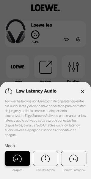 | Aplicación | App Loewe Leo: ecualizador, personalización de sonido Mimi, ajustes de ANC/transparencia, actualización de firmware y gestión de dispositivos |