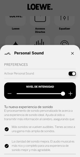 Ya que he hablado antes de la personalización de sonido, conviene empezar por ahí. Puede que estemos ante uno de los sistemas más coherentes que he probado hasta la fecha. No se trata de restarle méritos al Personi-Fi de JBL, pero la implementación de Loewe resulta especialmente interesante. La app realiza una audiometría en tiempo real, en la que incluso hay que ajustar un ruido de fondo hasta acercarlo lo máximo posible al umbral de escucha real del usuario. A partir de ahí se corrigen determinadas frecuencias de forma individualizada y, al menos en mi caso, el resultado es claro: este paso es fundamental para empezar a entender cómo suenan realmente los Leo.