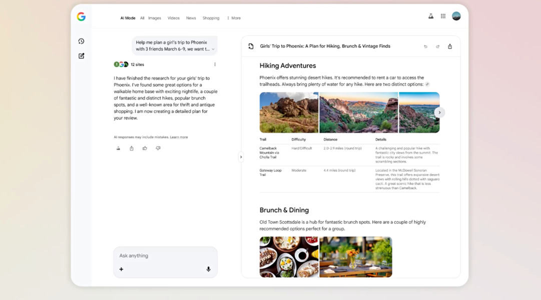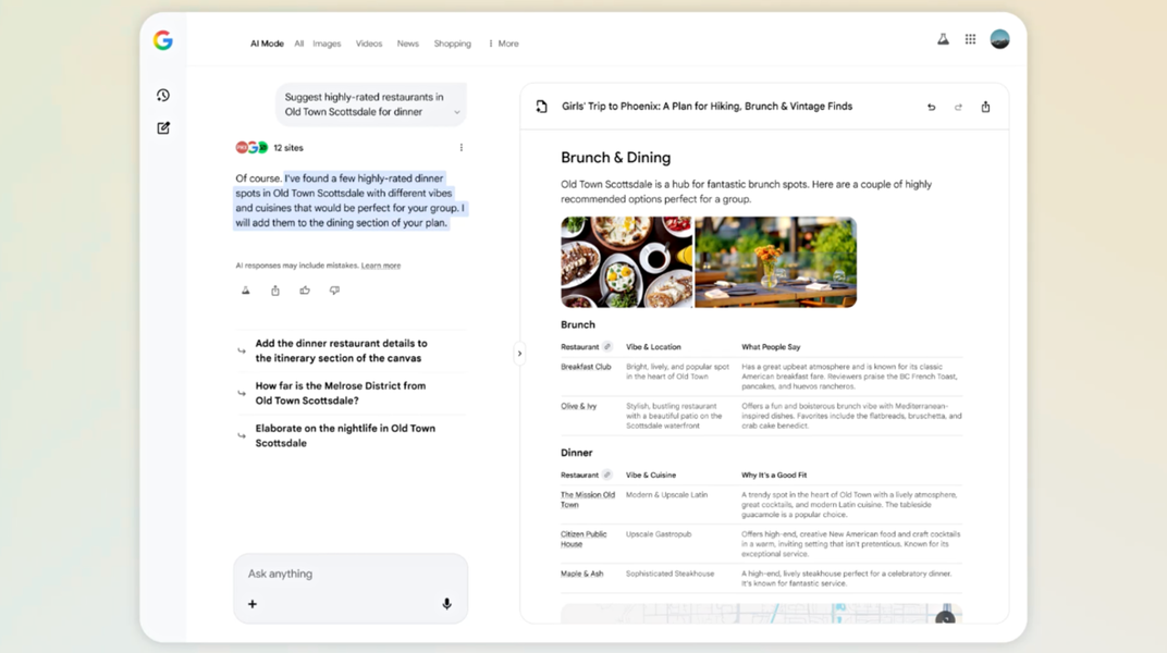La novedad más llamativa llega a través de Canvas, el espacio de trabajo del Modo IA. A partir de ahora, ya no necesitas preparar una lista interminable de "lugares que ver": basta con describir qué tipo de viaje quieres hacer -una escapada gastronómica, unas vacaciones con amigos, una ruta cultural por una ciudad europea, un fin de semana de relax- para generar un itinerario completo y personalizado.