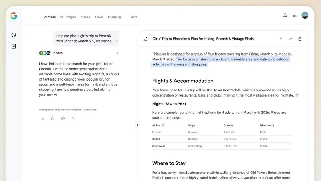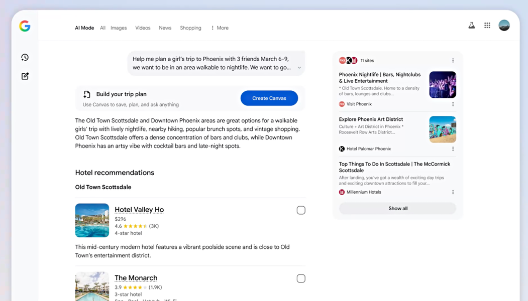 Canvas, Flight Deals y las nuevas reservas inteligentes aterrizan en el Modo IA para que organizar un viaje deje de ser un caos