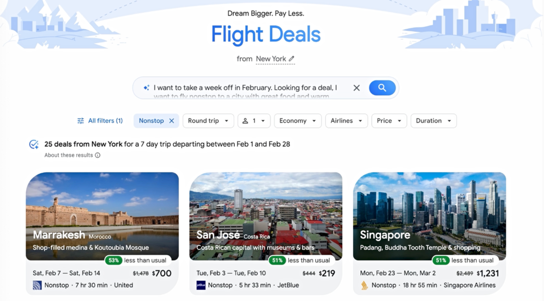 La segunda pieza clave es Flight Deals, una función de IA integrada en Google Flights. Hasta ahora estaba disponible solo en algunos países, pero Google la ha ampliado a más de 200 países y territorios, con compatibilidad en más de 60 idiomas.