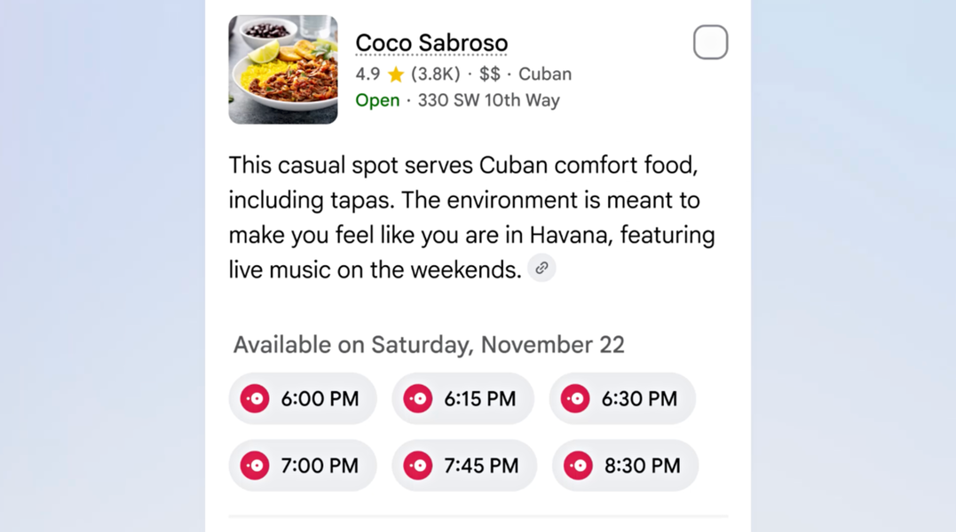 Google también ha dado un paso adelante con las reservas inteligentes. Ahora, la IA puede buscar disponibilidad en tiempo real en restaurantes, eventos y servicios locales, mostrando una selección de opciones con enlaces directos para reservar en plataformas como OpenTable, Resy, Tock, Ticketmaster, StubHub, SeatGeek, Booksy o Fresha, entre otros.