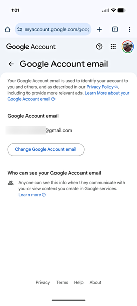 - Dentro de "Correo electrónico de la cuenta de Google", selecciona "Cambiar la dirección de correo electrónico de su cuenta de Google".