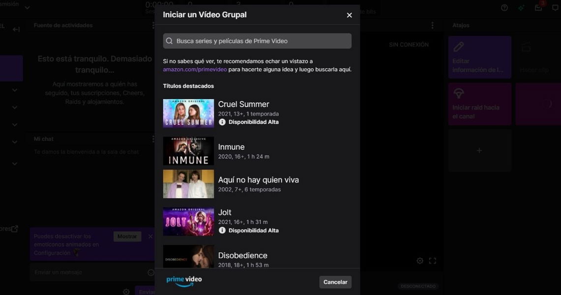 En esta guía vamos a aprender dos procedimientos muy importantes: el que sirve para crear estos vídeos grupales -solo se puede hacer en la versión de escritorio- y el que sirve para unirse a esa visualización de películas y series en grupo -también en Android e iOS-. Es preciso tener en cuenta que Twitch es una plataforma de Amazon, por lo que solo se puede compartir contenido de su plataforma, Amazon Prime Video.