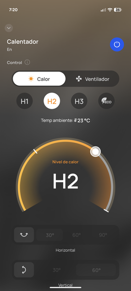La interfaz es limpia, moderna e increíblemente intuitiva. Desde la pantalla principal, tienes acceso a todas las funciones del dispositivo de una forma visual y clara. Puedes encenderlo y apagarlo, ajustar la temperatura grado a grado, cambiar entre los diferentes modos (alta potencia, baja potencia, ECO, solo ventilador), controlar la oscilación horizontal y vertical de forma independiente y programar el temporizador. Todo responde al instante, sin retardos ni cuelgues.