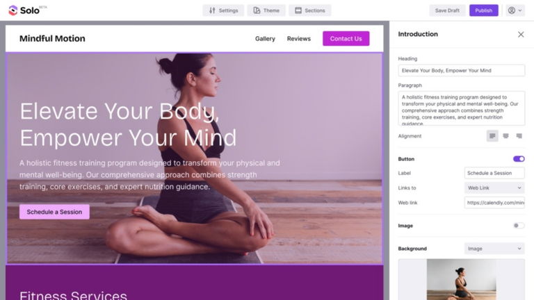 Por ejemplo, si quieres crear una página web sobre tu negocio de repostería, Solo analizará tu texto y generará imágenes de pasteles, galletas, cupcakes y otros productos que ofreces. También elegirá una paleta de colores y un estilo que combinen con tu temática y tu tono.