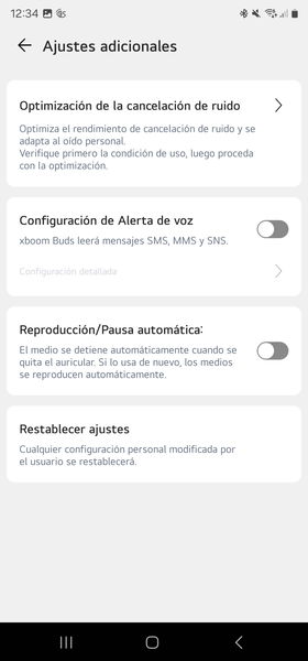 La app LG XBOOM Buds es muy útil y competente. Hace justo lo que tiene que hacer, como lo tiene que hacer y sin marear al usuario. En este aspecto parece que se han agenciado un par de páginas del manual de juego de JBL, que tiene este campo bastante controlado. No es la única, ya que estos auriculares con compatibles con Auracast, el protocolo desarrollado por JBL para que distintos dispositivos Bluetooth "hablen" entre sí y permitan reproducir un mismo contenido simultáneamente entre ellos. Y Auracast en estos auriculares funciona de escándalo.