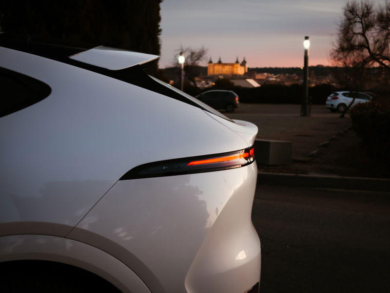 El frontal sigue presidido por esa barra de luz LED continua (conocida como "Robot Face") que le da una presencia nocturna inconfundible. Sin embargo, el paragolpes delantero se ha limpiado aún más. Es más minimalista, más aerodinámico. En la parte trasera es donde más se nota la mano de los diseñadores: han incluido un mini alerón que le da un toque "GT" muy interesante. No es el alerón activo de un Porsche, es un detalle sutil que alarga la silueta y rompe la caída del techo de una forma muy elegante.