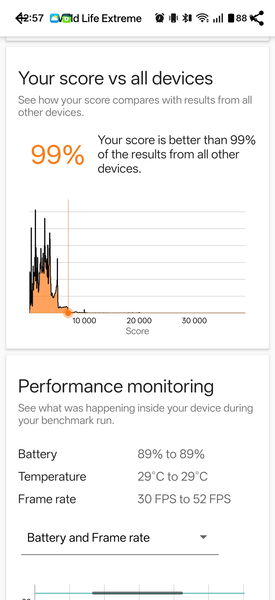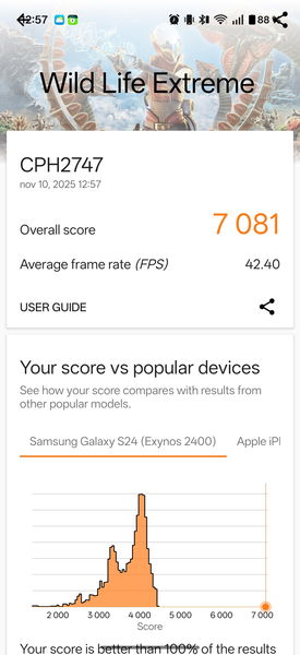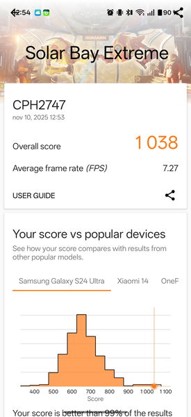 Nuestras impresiones respecto al rendimiento del OnePlus 15 se han confirmado mediante las pruebas sintéticas a las cuales lo hemos sometido. Así, en la aplicación '3D Mark', este nuevo smartphone de OnePlus ha obtenido una puntuación de 1.038 puntos en la prueba "Solar Bay Extreme" y un total de 7.081 puntos en la prueba "Wild Life Extreme".