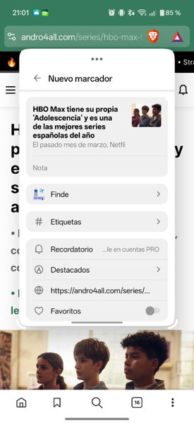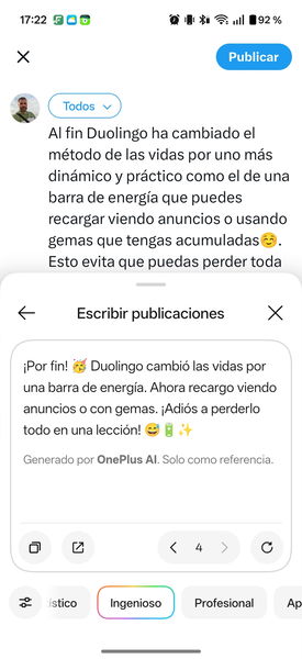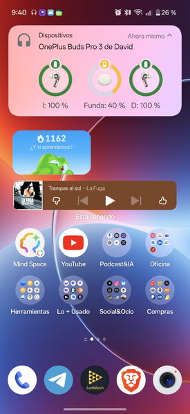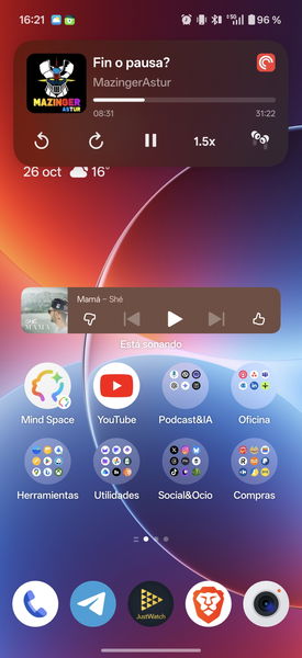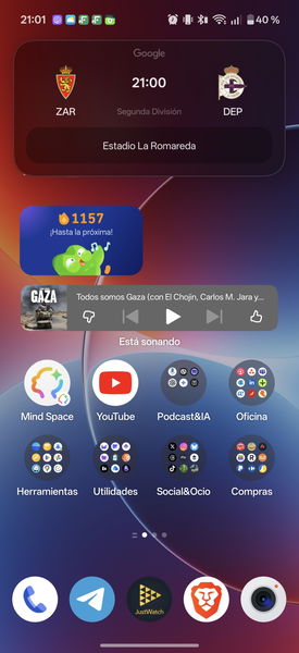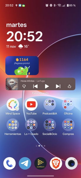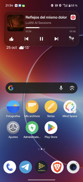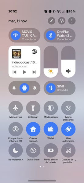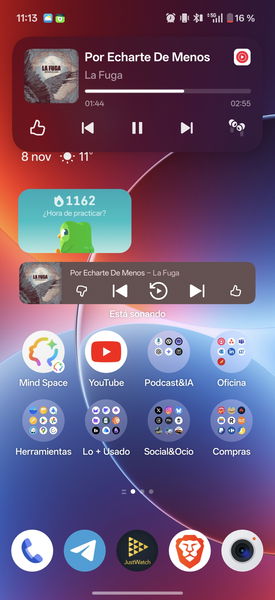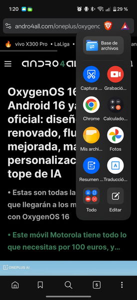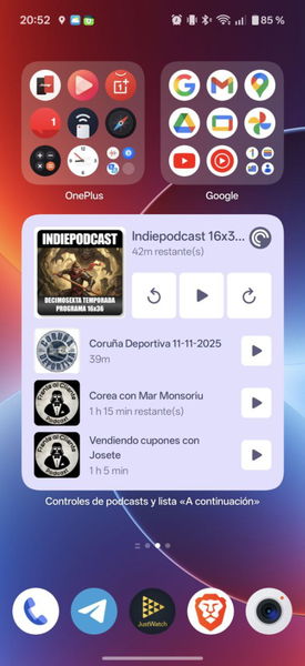 Otro detalle que nos ha gustado mucho es que esta nueva interfaz es mucho más fluida que la de la versión anterior y eso se nota sobre todo al abrir, cerrar y cambiar entre aplicaciones en la multitarea. Además, OxygenOS 16 incorpora un nuevo sistema llamado "dual app control" que te permite abrir dos aplicaciones al mismo tiempo en la pantalla, algo que me ha resultado realmente útil para guardar enlaces en la app 'Raindrop' sin perder de vista la fuente original (ya que puedes acceder a la vista completa de una app deslizando hacia abajo en la ventana emergente) y también integra en la parte superior de la pantalla una "isla dinámica" gracias a la cual podrás controlar la reproducción de música y/o podcasts, comprobar el estado de la batería de tus auriculares bluetooth y estar al tanto de los partidos de tu equipo de fútbol.