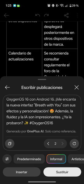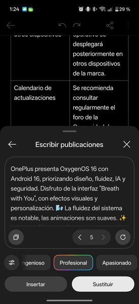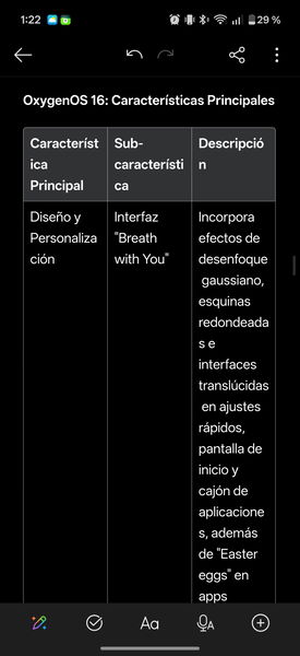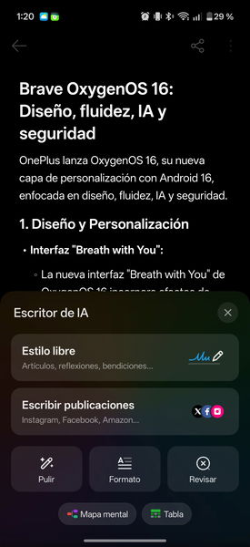A mayores del 'Mind Space', OxygenOS 16 también integra el "escritor de IA", un asistente de escritura que te ayudará a crear tus textos para redes sociales y formatear tus notas con diferentes estilos de escritura, un potente editor de imágenes incorporado en la app de "Fotografías" con el que podrás borrar personas y objetos de una fotos, mejora su luminosidad o ajustar su grado de desenfoque, una herramienta que se encargará de resumir cualquier página web y guardar el resumen en la app de Notas y una grabadora de voz que es capaz de grabar, transcribir, identificar voces y generar resúmenes automáticos de tus audios.