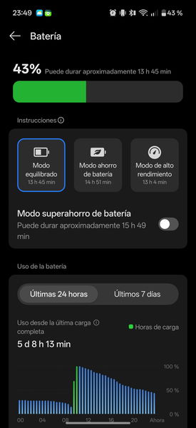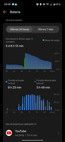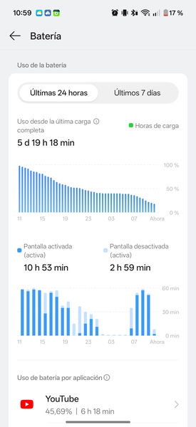 Tal como puedes apreciar en las capturas de pantalla que te dejamos sobre estas líneas, realizando un uso moderado del dispositivo hemos llegado a los dos días de uso con más de 5 horas de pantalla activa con el modo "Always On Display" activado.
