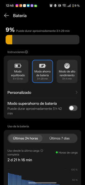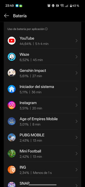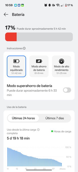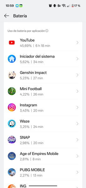 Como estos tests no nos parecían suficientes, hemos sometido al OnePlus 15 a unas pruebas extremas de batería y ha aprobado con nota, ya que hemos llegado al final de un día de uso en el que hemos tirado mucho de YouTube, Waze, Instagram y varios juegos demandantes como 'Genshin Impact' o 'PUGB Mobile' con casi 9 horas y media de pantalla activa y un 43 % de batería restante. Este ciclo de batería se completó a media mañana del día siguiente con casi 11 horas de pantalla activa y un 17 % de batería restante.