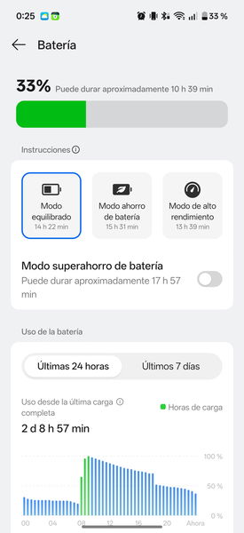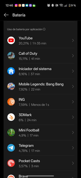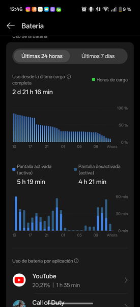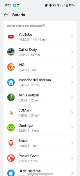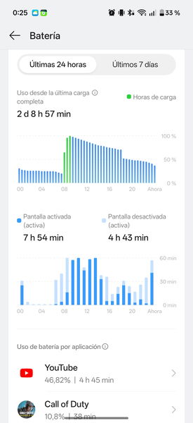 Pero las cifras que te van a sorprender son las que hemos logrado al hacer un uso más intensivo del terminal, puesto que hemos llegado al final de un día intenso en el que hemos usado mucho YouTube y hemos jugado unas partidas al 'Call of Duty: Mobile' con casi 8 horas de pantalla activa y un 33 % de batería restante.