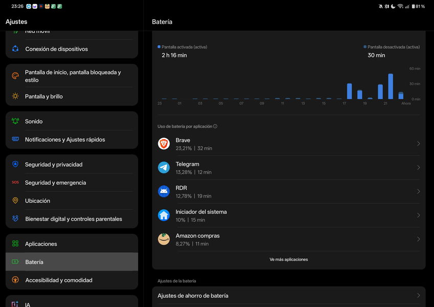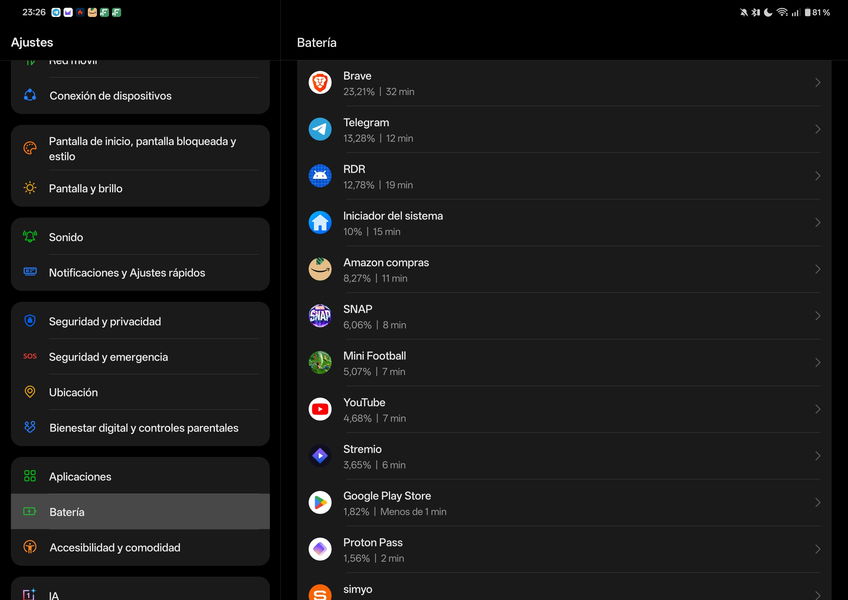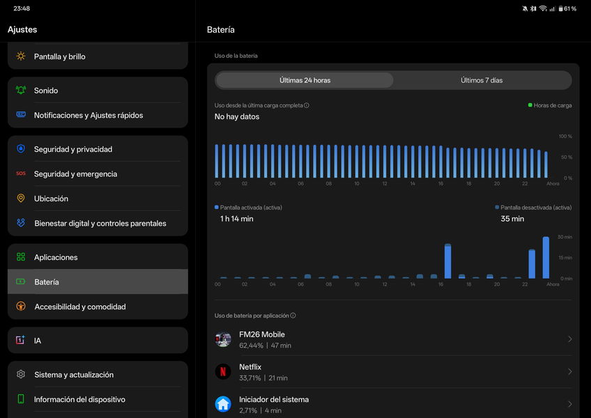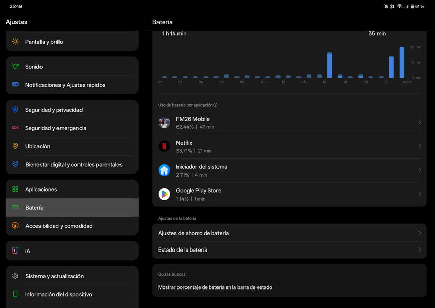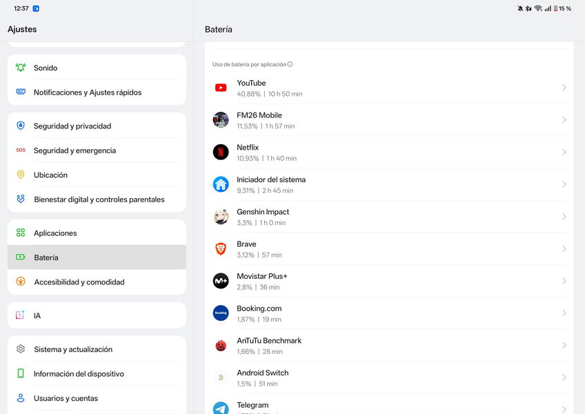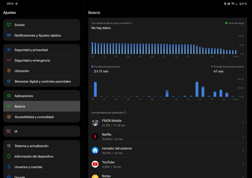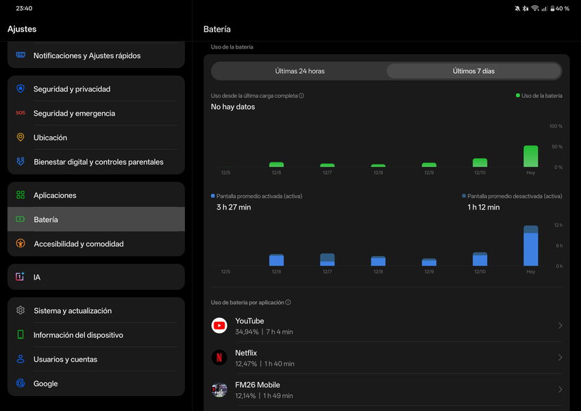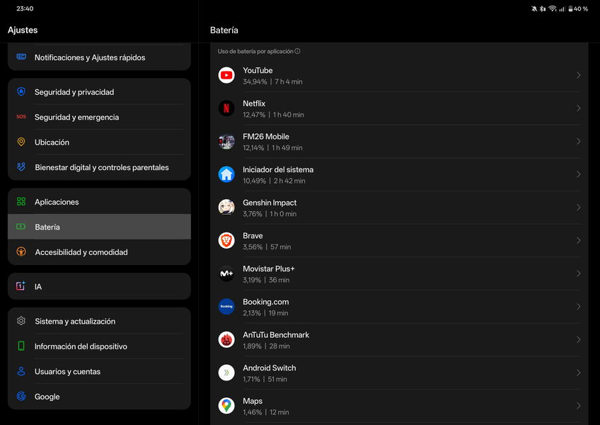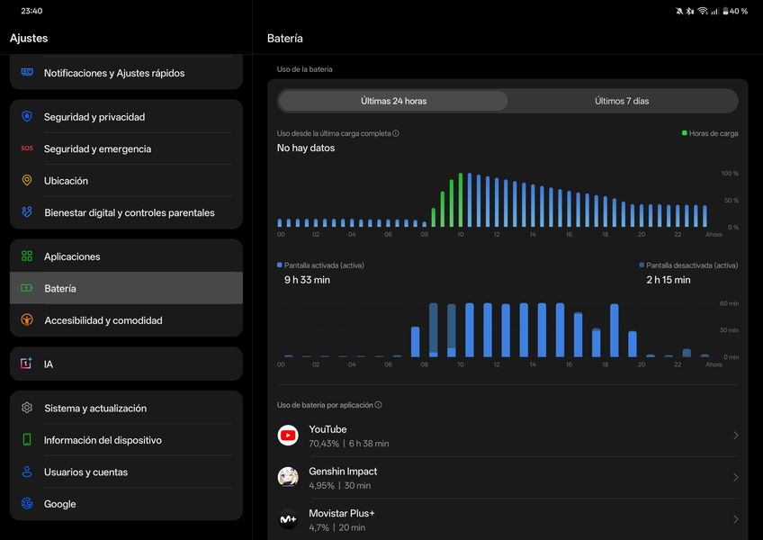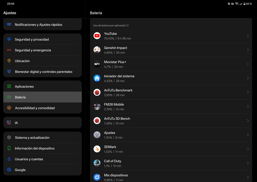 Asimismo, en un día muy intenso de uso viendo muchos vídeos de YouTube y jugando a juegos como Genshin Impact, FM26 Mobile y Call of Duty: Mobile, he llegado al final del mismo con 9 horas y media de pantalla y con un 40 % de batería restante.