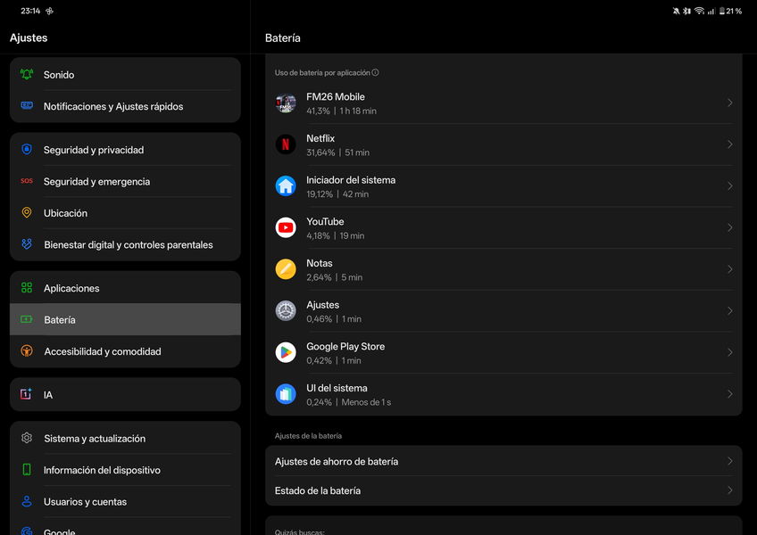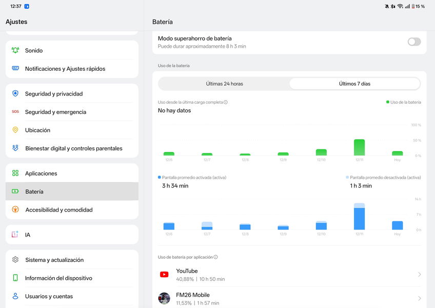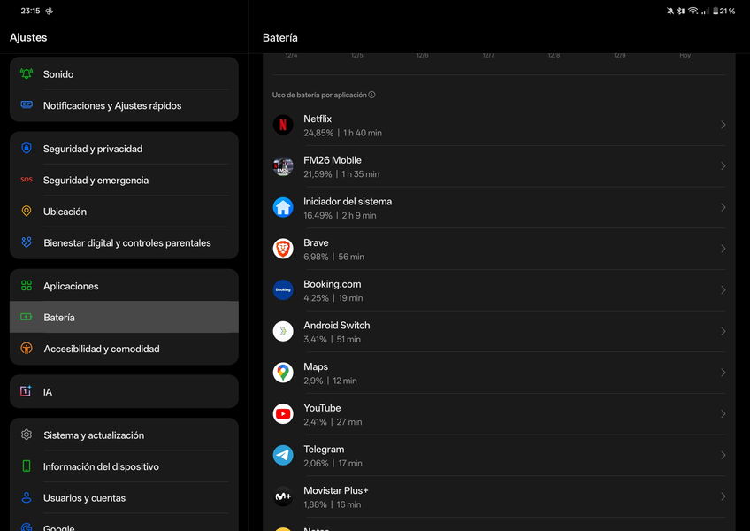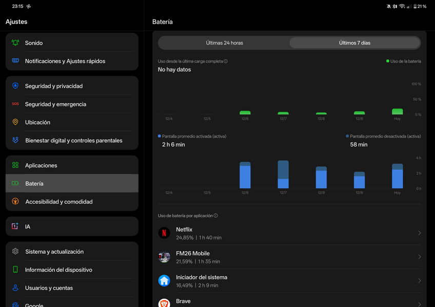 En las pruebas que he llevado a cabo con la batería de la OnePlus Pad Go 2, realizando un uso moderado de la misma tirando de navegación web, consumo multimedia y algún que otro juego he llegado sin problemas a los 5 días completos con una media de 2 horas de pantalla al día y con un 21 % de batería restante al final del ciclo.