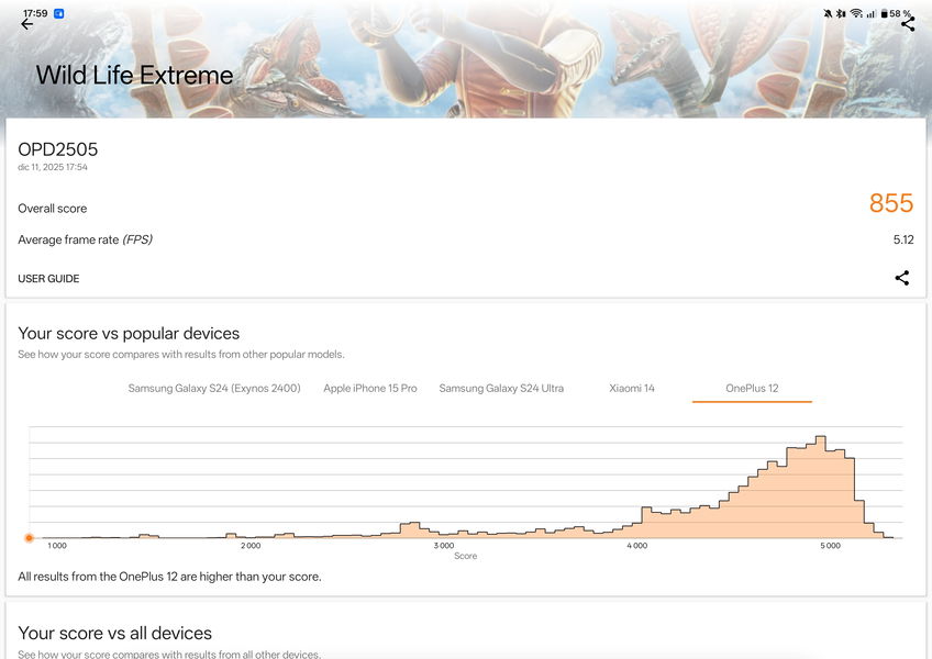 Mis sensaciones personales se han confirmado con las pruebas sintéticas que he realizado con la OnePlus Pad Go 2, ya que usando la app "3D Mark" y sometiendo la tableta a la prueba "Wild Life" he obtenido una puntuación de 855 puntos y un rango promedio de FPS de 5,12. Asimismo, al pasarle el bechmark AnTuTu, esta tablet consiguió un total de 963.203 puntos, una cifra que la sitúa muy cerca de otros dispositivos que montan procesadores "teóricamente" más potentes.