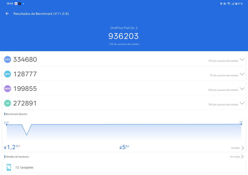 Otro aspecto destacable de la OnePlus Pad Go 2 es que no he notado que sobrecaliente en exceso, ya que, si bien al exigirle un poco su temperatura aumenta, esta no es llega a ser molesta ni provoca caídas de rendimiento apreciables.