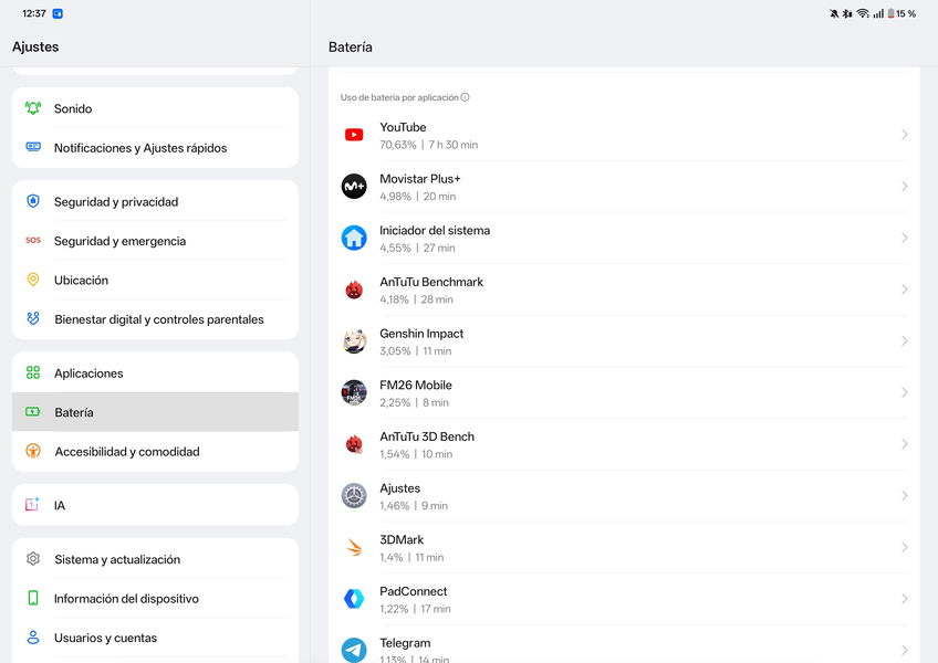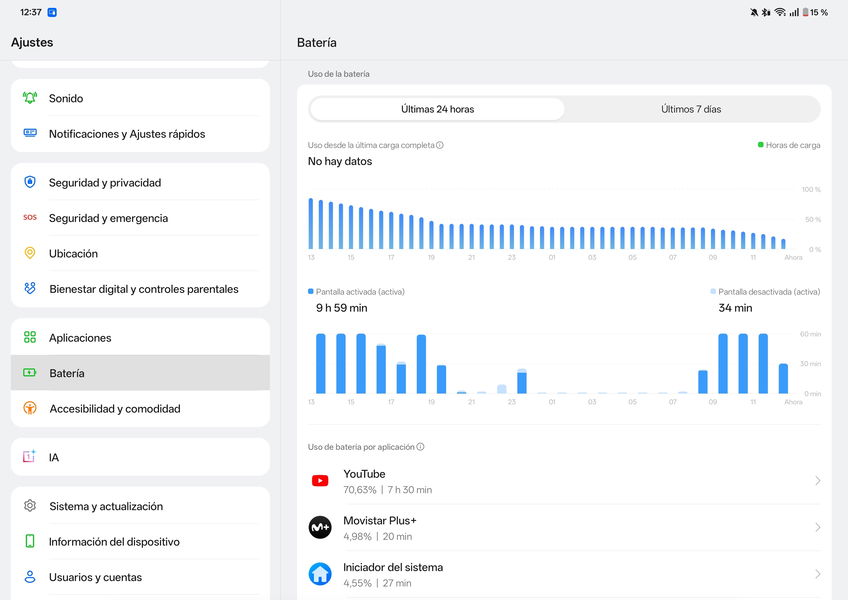 Tampoco se queda corto en autonomía el OnePlus Pad Go 2 Stylo, ya que puede aguantar hasta 20 horas con una sola carga y con solo 10 minutos de carga tienes hasta 12 horas de uso, algo que hemos podido verificar durante estas semanas de prueba.