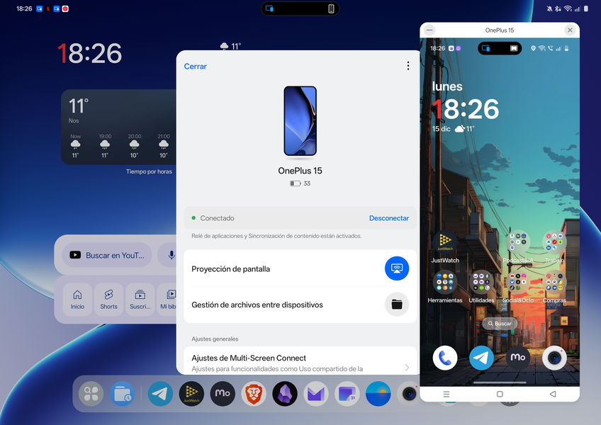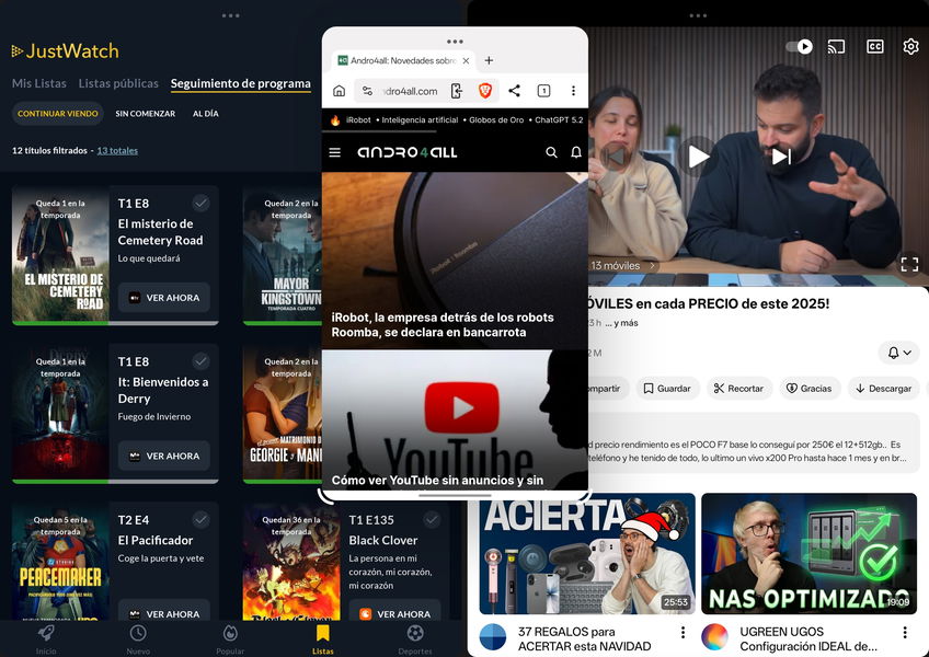 Esto me ha permitido ver un vídeo de YouTube de UrbanTecno, leer las noticias de Andro4all en el navegador Brave y consultar las series que estoy viendo a través de la app de JustWatch todo en una única pantalla.