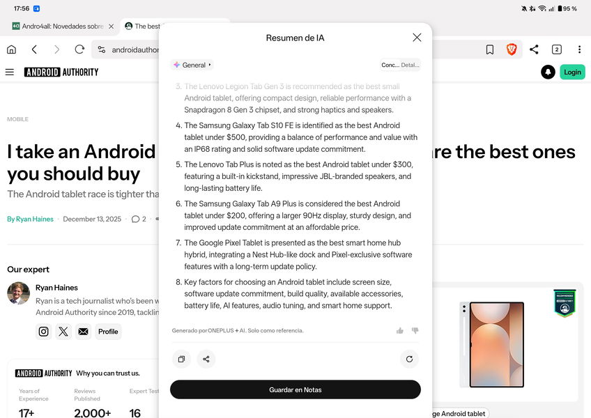 Obviamente, la OnePlus Pad Go 2 incorpora todas las funciones de IA integrada en OnePlus AI, entre las que debemos destacar 'AI Writer', un asistente de escritura que te permite modificar el tono de un texto y crear borradores para correos electrónicos o para publicaciones de redes sociales, 'AI Recorder', una potente grabadora de voz con la que vas a poder grabar notas de voz, reuniones o clases y que estas se transcriban automáticamente a texto, 'AI translate', una completa herramienta que te ofrece traducción simultánea en pantalla manteniendo el formato de texto original y la posibilidad de traducir textos de artículos en otro idioma a medida que los vas leyendo, 'Resumen de IA', una práctica funcionalidad con la que vas a poder resumir artículos o páginas web y guardar esos resúmenes en la app de Notas y 'AI Editor', un avanzado editor de imágenes que te permitirá eliminar personas u objetos de una foto, mejorar las fotografías borrosas y eliminar los brillos y reflejos no deseados de una fotografía.
