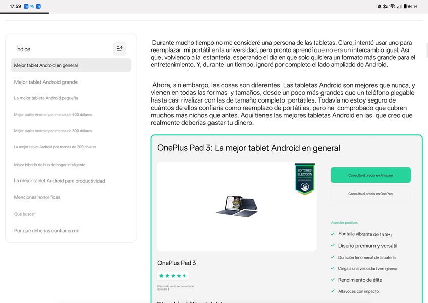 Sin embargo, además de la calidad del panel, la característica del mismo que me ha cautivado es su ratio de aspecto 7:5, el cual hereda de su hermana mayor, la OnePlus Pad 3. Esto hace que la pantalla de la OnePlus Pad Go 2 sea tremendamente cómoda para navegar por Internet, leer libros o artículos y usar varias aplicaciones a la vez, puesto que muestra más contenido vertical que los clásicos 16:9 o 16:10.