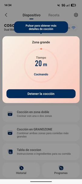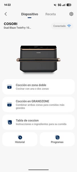 Otra cosa que me ha maravillado de la Cosori Dual Blaze Twinfry es que se puede controlar desde el móvil. No solo podemos elegir la función, el tiempo o la temperatura, la app también nos informa sobre la configuración ideal dependiendo del tipo de alimentos que queramos preparar. Además, para aquellos que no son expertos en la cocina, dispone de un recetario online para descubrir nuevas recetas.