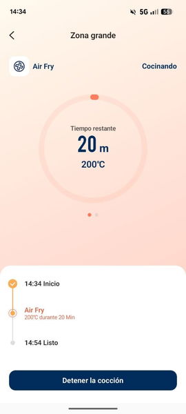 Uno de los detalles más diferenciales de esta Cosori Dual Blaze Twinfry es que se puede controlar por el móvil, pues es compatible con la app VeSync. Me ha parecido tremendamente útil esto, pues directamente desde el móvil podemos elegir si queremos cocinar en una zona, en dos zonas o en la bandeja completa. Además, podemos seleccionar uno de los 6 modos de cocción disponibles, así como el tiempo y la temperatura.
