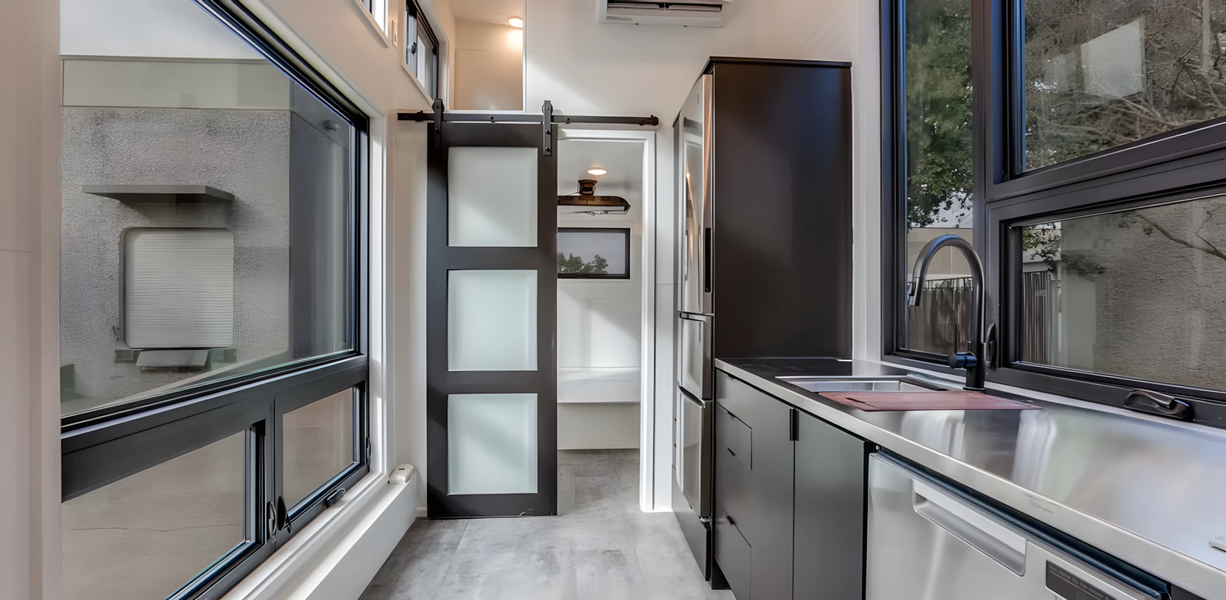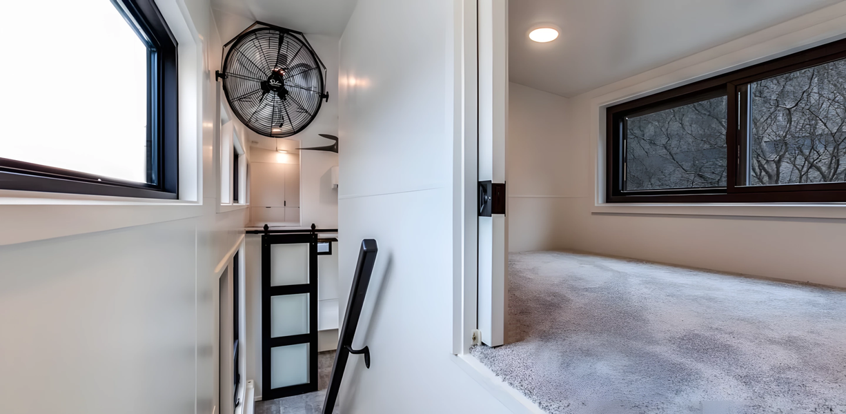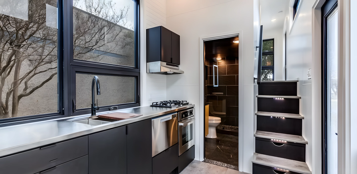 La distribución invertida de esta tiny house no es un capricho estético: es una forma inteligente de aprovechar la altura, la luz y cada metro cuadrado