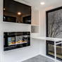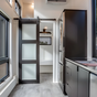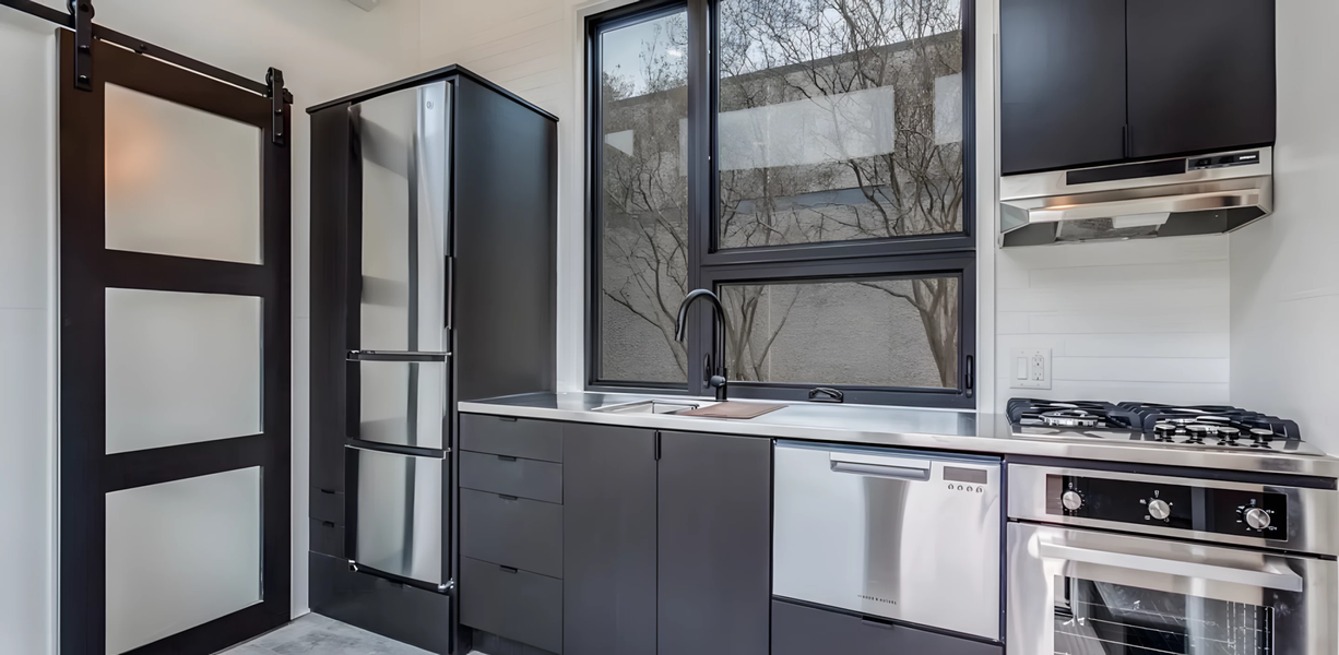 Nada más entrar, el acceso desemboca directamente en la cocina, que actúa como centro neurálgico de la vivienda. Lejos del típico "rincón funcional", aquí es un espacio protagonista, luminoso y bien equipado: lavavajillas, horno, placa de cuatro fuegos y un frigorífico con cajones, además de una encimera de acero inoxidable con fregadero integrado. El almacenamiento está muy bien resuelto, con armarios por todas partes, una despensa extraíble y hasta una mesa extensible que se guarda cuando no se usa, uno de esos detalles que marcan la diferencia en una casa pequeña.