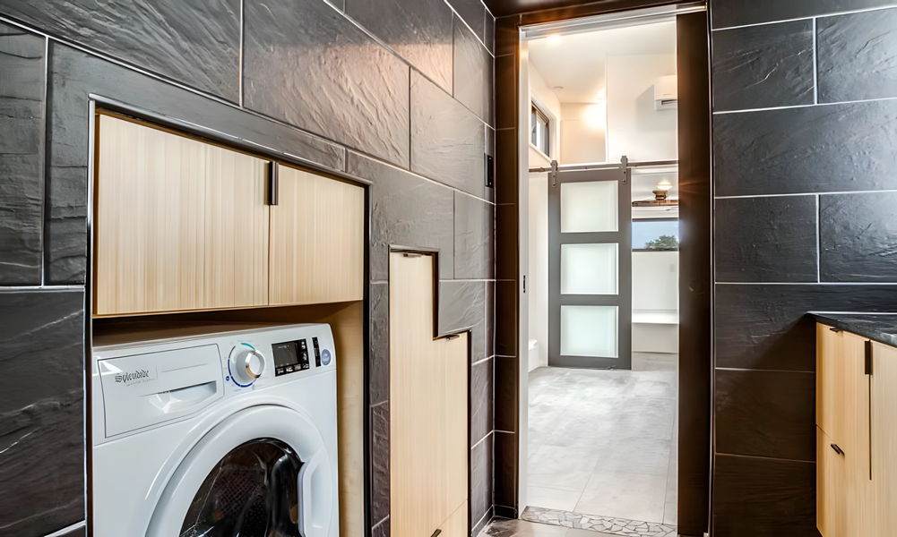 Al otro lado se encuentra el baño, separado por una puerta corredera y con un acabado contemporáneo que no escatima en equipamiento: ducha con mampara de cristal, lavabo, inodoro y lavadora-secadora integrada. Todo compacto, pero sin sensación de estrechez.