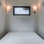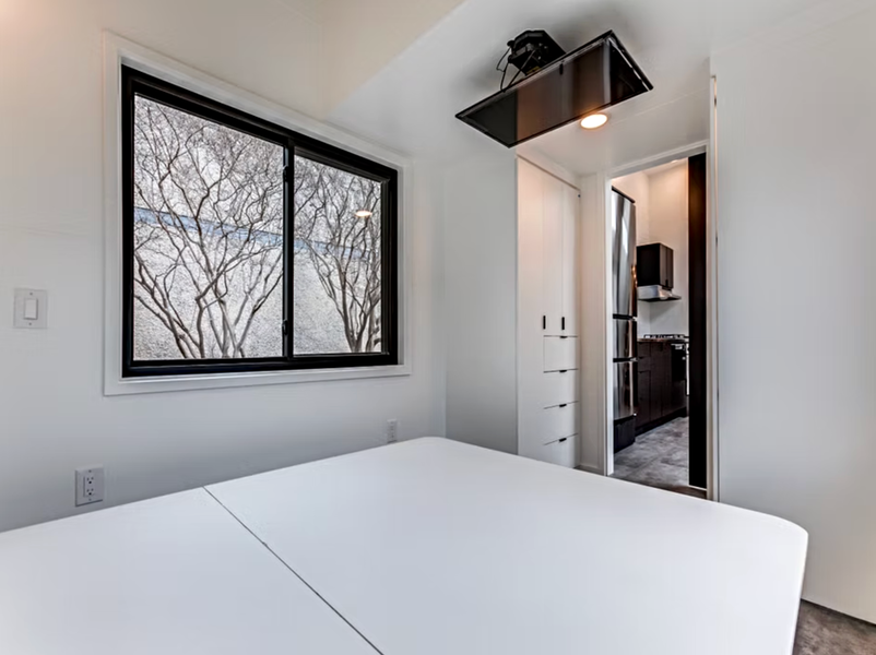 A un lado de la cocina se sitúa el dormitorio principal, en la planta baja. Y aquí empieza a entenderse el sentido del diseño "al revés". Al bajar la zona de descanso, se gana altura real para moverse de pie, algo que muchas tiny houses sacrifican cuando colocan la cama en un altillo. La habitación cuenta con cama queen size con almacenaje, armarios empotrados y un detalle poco habitual: un televisor instalado en el techo, que se despliega para verlo cómodamente desde la cama.