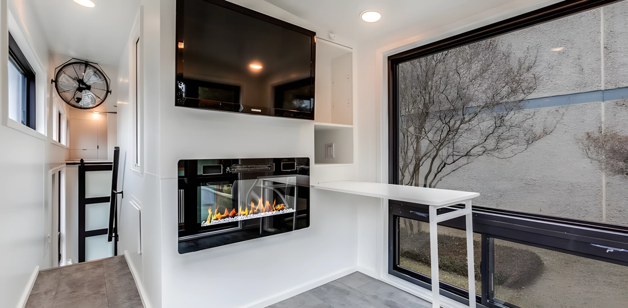 El salón o cuarto de estar, en cambio, se eleva. Se accede por unas escaleras con espacio de almacenamiento y ofrece una zona más abierta y polivalente, con televisor de pared, chimenea eléctrica y un escritorio plegable que permite trabajar desde casa sin invadir el resto del espacio. Además, esta distribución libera sitio para algo poco común en este tipo de viviendas: dos lofts adicionales, uno pensado como gran armario y otro que puede funcionar como dormitorio extra o trastero.