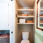 El dormitorio principal está en un altillo donde solo puedes estar agachado debido a la poca altura. El baño es minúsculo e incluye ducha con inodoro de descarga, una configuración que ya hemos visto en otras casas sobre ruedas para parejas. El segundo altillo es poco más que una estantería grande para guardar algunos bultos.