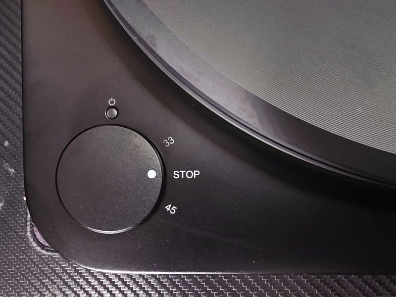 Volviendo a los controles manuales, en el plinto se sitúan la perilla de reproducción y la de selección de velocidad. Aquí tenemos un selector de tres posiciones: hacia arriba para reproducir a 33 rpm, al medio para parar y abajo para reproducir a 45 rpm. Funciona correctamente y el motor gira de manera constante, sin tirones. Ahora bien, las posiciones me han resultado un poco contraintuitivas por mi propia memoria muscular: estoy acostumbrado a bajar el selector para reproducir a 33 rpm, lo que ha llevado a alguna que otra situación cómica…