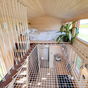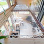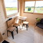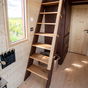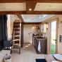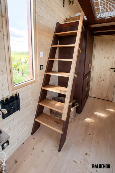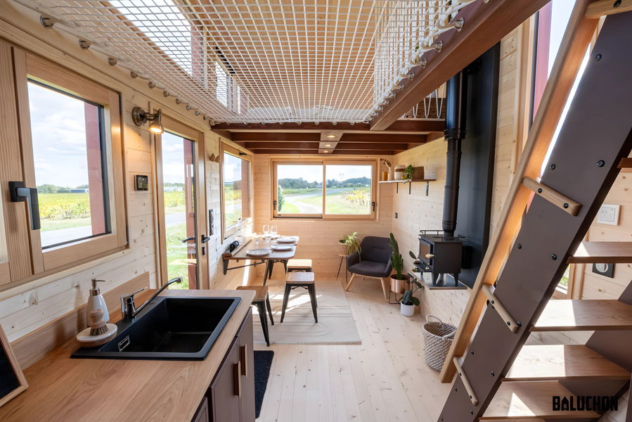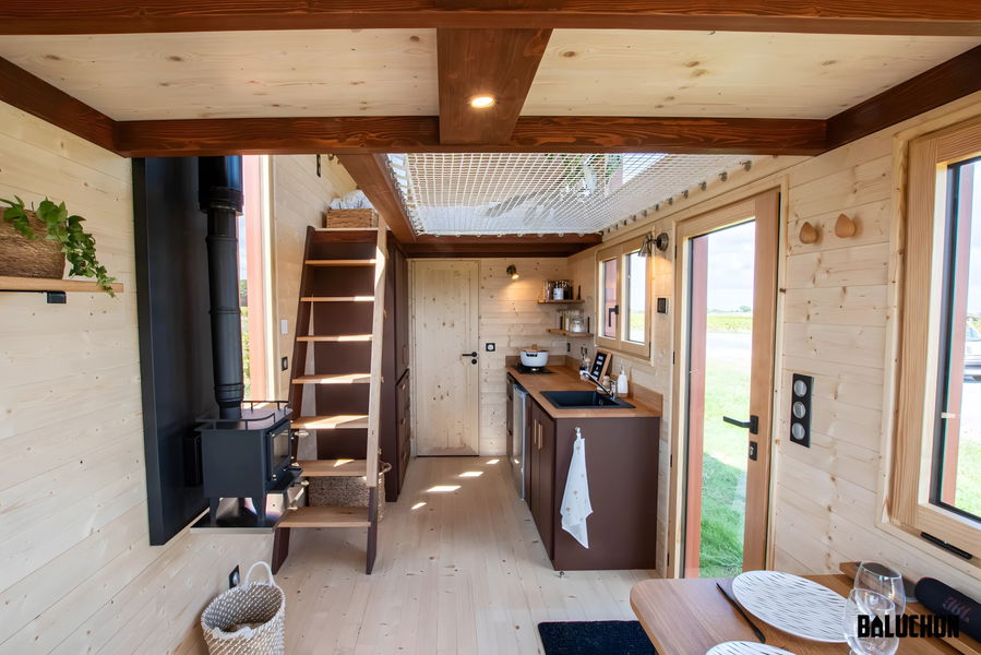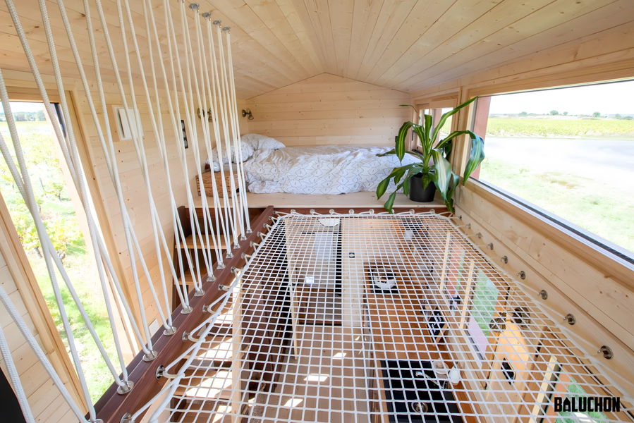 Lo más ingenioso está arriba. Para encajar dos dormitorios con techos bajos, han conectado la habitación principal con el resto de la casa mediante una red transitable suspendida sobre el salón. Esto permite que la luz fluya entre niveles y evita esa sensación de ataúd típica de los altillos, una solución más creativa que la de otras minicasas de lujo remolcables que suelen apostar por pasillos oscuros o escaleras que comen demasiado espacio útil en la planta baja.