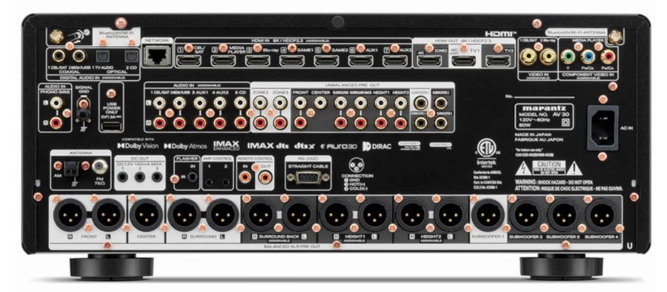 La información técnica publicada por eCoustics confirma que el AV 30 mantiene los elementos clave del diseño de la marca: chasis reforzado para evitar vibraciones, componentes de amplificación propios —los módulos HDAM-SA2 que Marantz usa desde hace años—, y siete entradas HDMI en la trasera más tres salidas. Una de esas salidas sirve para llevar señal a otra habitación sin necesidad de duplicar equipos.