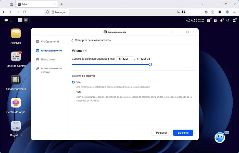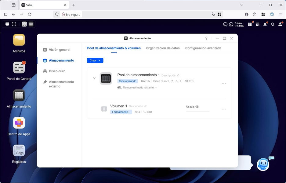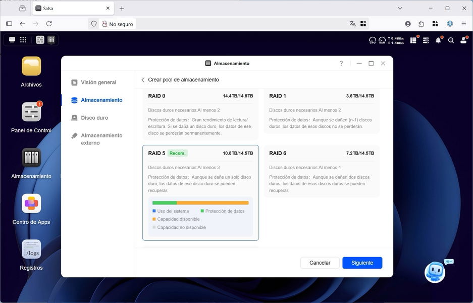 - Accederás al configurador de almacenamiento para configurar el formato de los discos duros. Tendrás que elegir entre RAID 0 (sin protección), RAID 1, RAID 5 (requiere al menos 3 discos duros y es la opción más recomendada para evitar la pérdida de datos ) o RAID 6 (requiere al menos 4 discos duros).