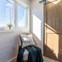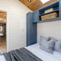 La distribución aprovecha varias claraboyas para que entre luz natural. Lo más llamativo: el dormitorio principal tiene altura suficiente para estar de pie, algo raro en casas de este tamaño, donde lo normal es ir agachado o directamente arrastrarse. A diferencia de propuestas como la casa de 1,95 m² de Levi Kelly, aquí hay espacio real para moverse.