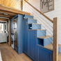 El altillo superior funciona como segundo dormitorio, aunque también sirve como almacén o sala multimedia según las necesidades. El espacio bajo la escalera no se desperdicia: hay cajones y huecos aprovechables para guardar cosas. La escalera en sí tiene compartimentos integrados en cada escalón, aprovechando cada centímetro disponible. Todo está pensado para maximizar el almacenaje sin que la casa parezca un tetris claustrofóbico.