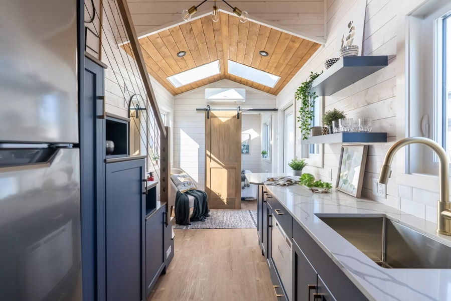La Gambier, de Rover Tiny Homes, aprovecha cada centímetro de sus 30 pies de longitud con cocina completa, baño y dos habitaciones