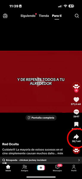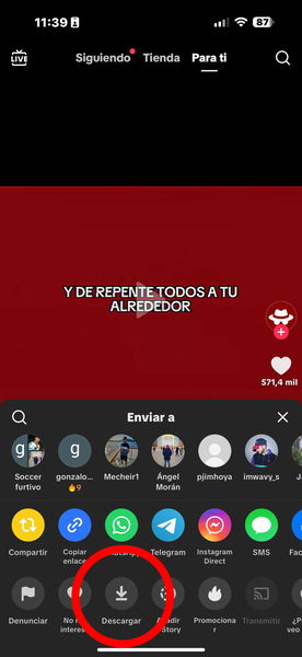 Si puedes o no descargar vídeos de TikTok, lo verás en el proceso de descarga. Accede al vídeo que te interese descargar y pulsa en el icono de flecha de la esquina inferior derecha. Se abrirá un menú en la parte inferior de la pantalla. En ese menú aparecerán varias opciones de compartir el vídeo, siendo la que nos interesa Descargar.