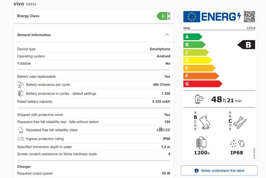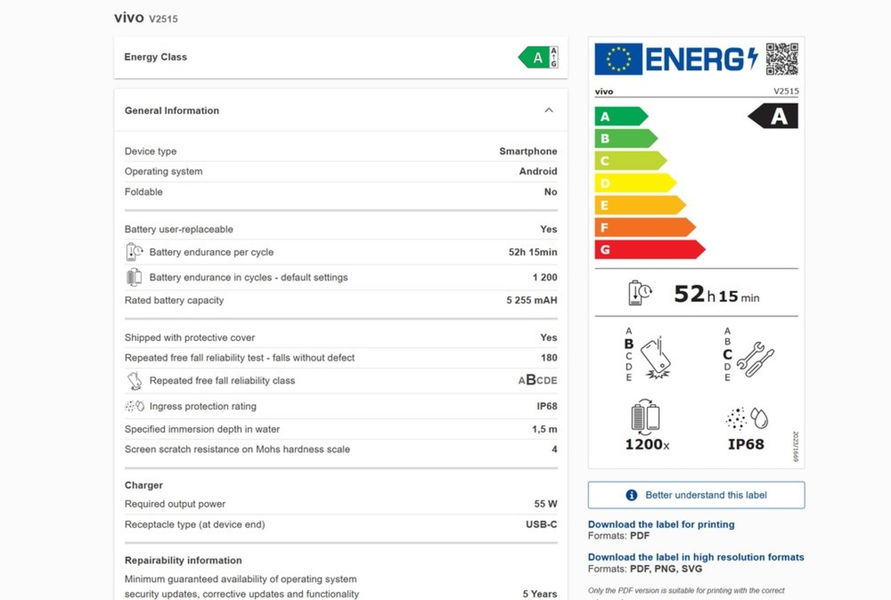 Las etiquetas energéticas publicadas en el EPREL para los vivo V2514 y vivo V2515